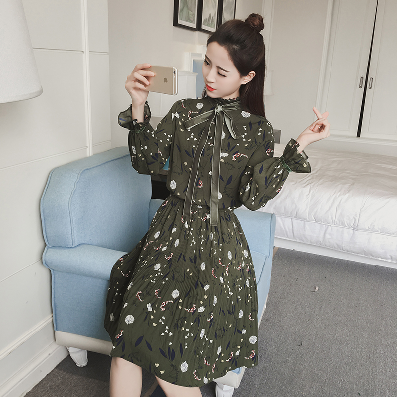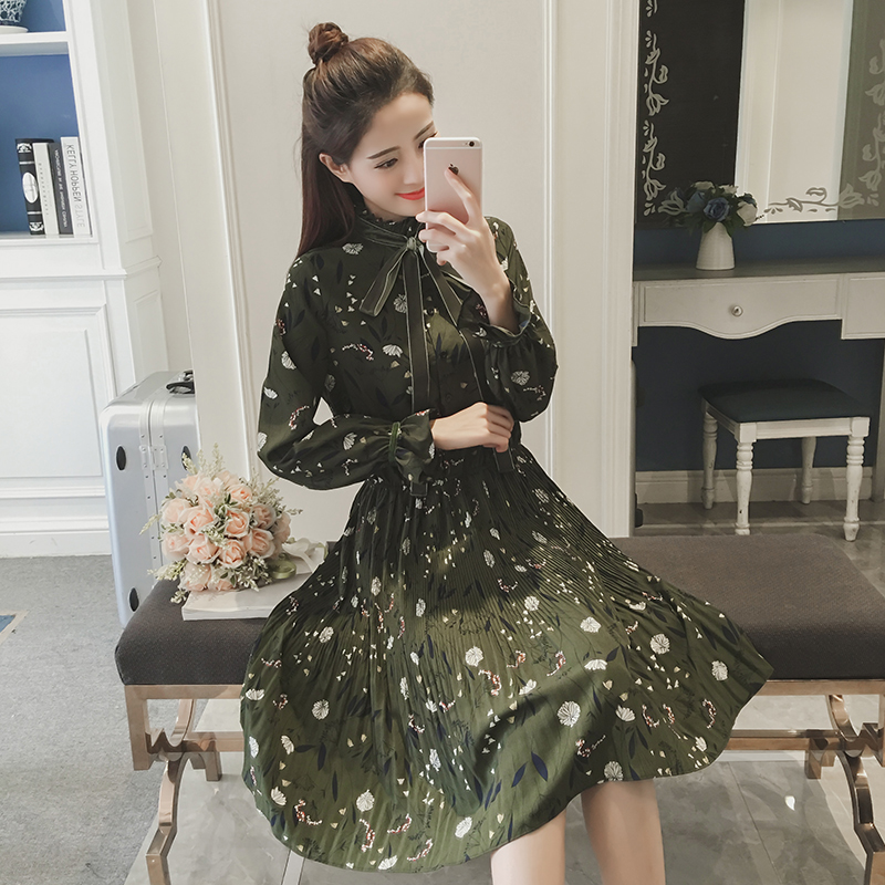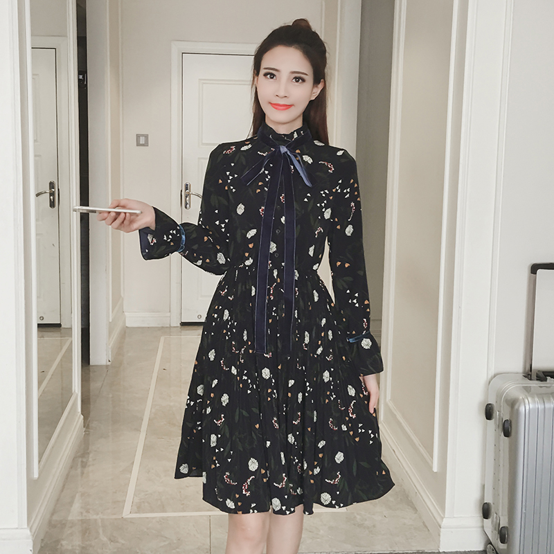 / 春新款女裝復古印花中長款打底裙顯瘦收腰碎花長袖連衣裙春秋