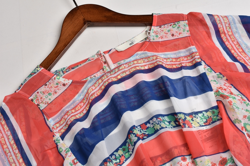 / 休閑百搭寬松顯瘦拼色印花春夏新款橫條紋雪紡衫