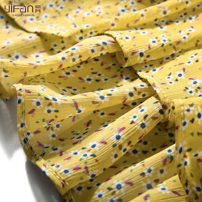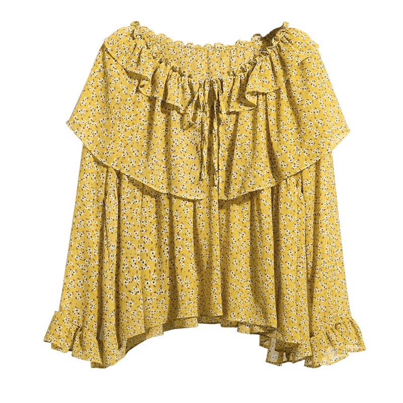 / 荷葉邊印花氣質碎花雪紡衫女春夏新款喇叭袖一字領上衣娃娃衫