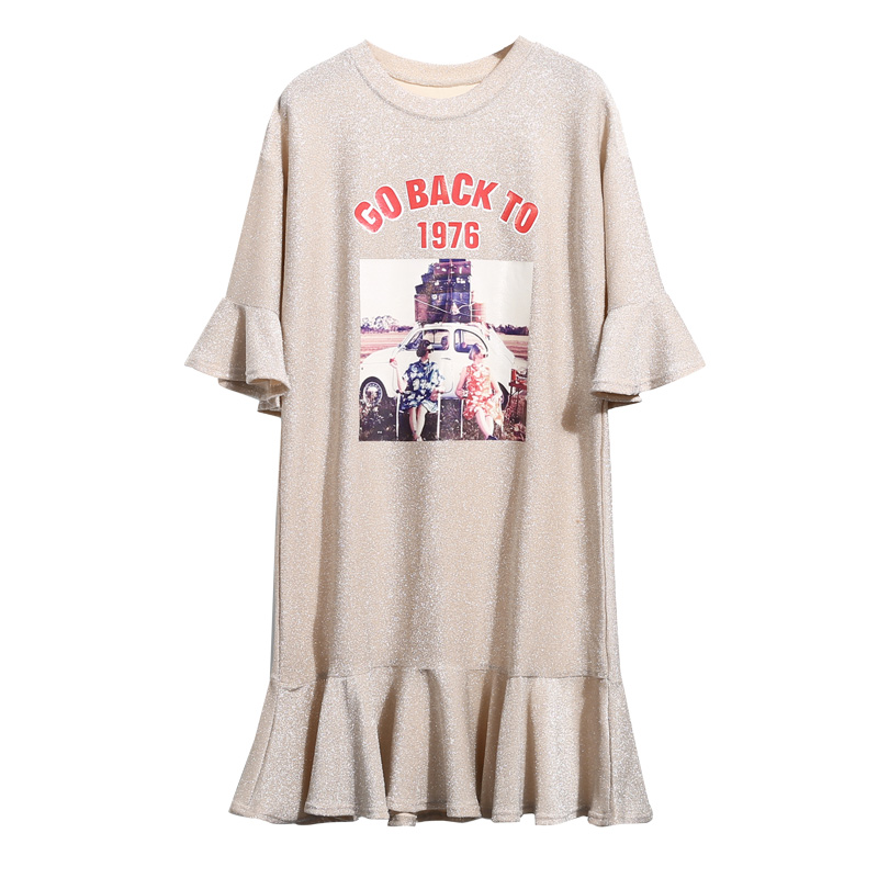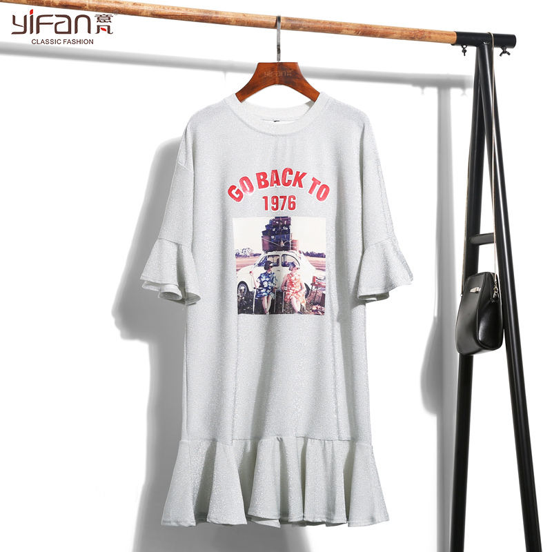 / 韓國新款夏季寬松百搭時尚印花喇叭袖中長款T恤裙連衣裙女裝