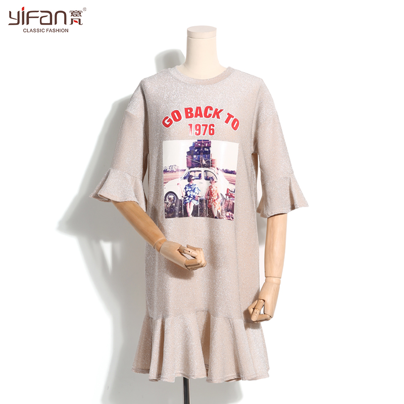 韓國新款夏季寬松百搭時尚印花喇叭袖中長款T恤裙連衣裙女裝