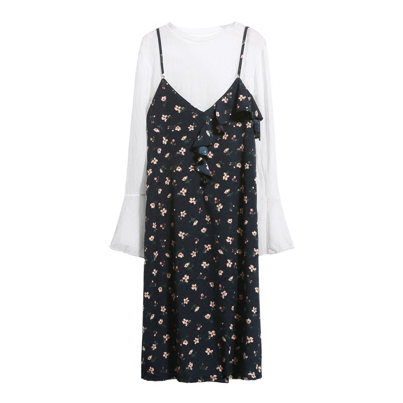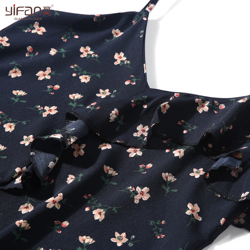 / 夏季新款碎花吊帶中長裙女裝韓版V領荷葉邊寬松腰雪紡打底連衣裙
