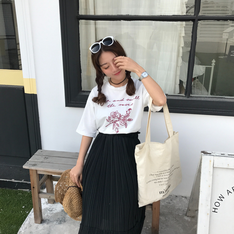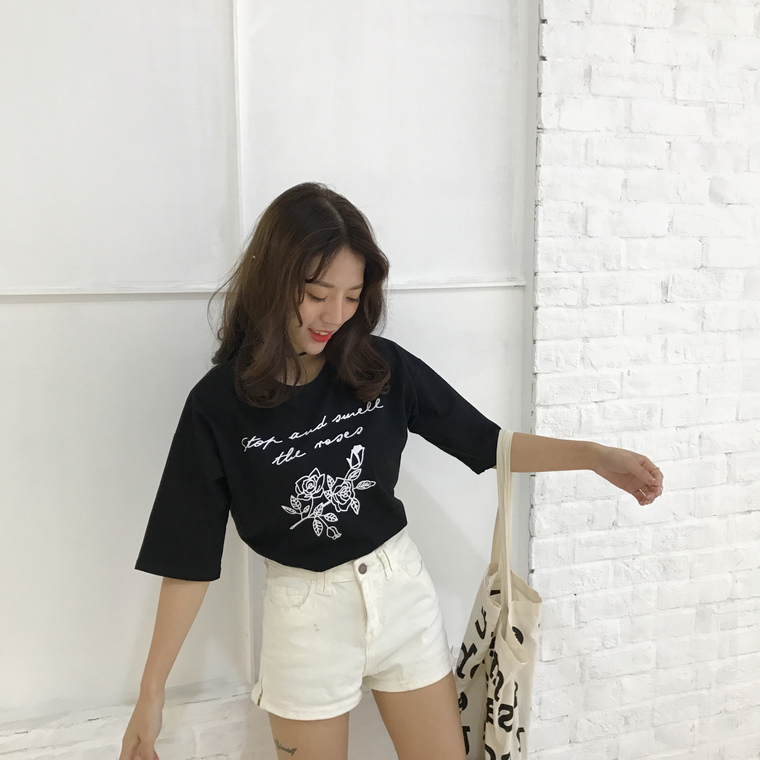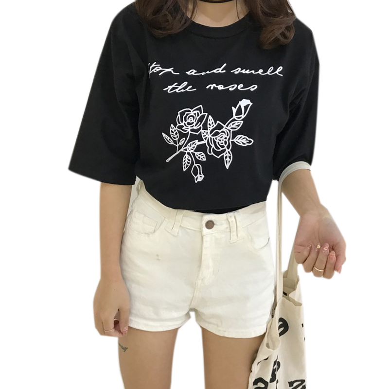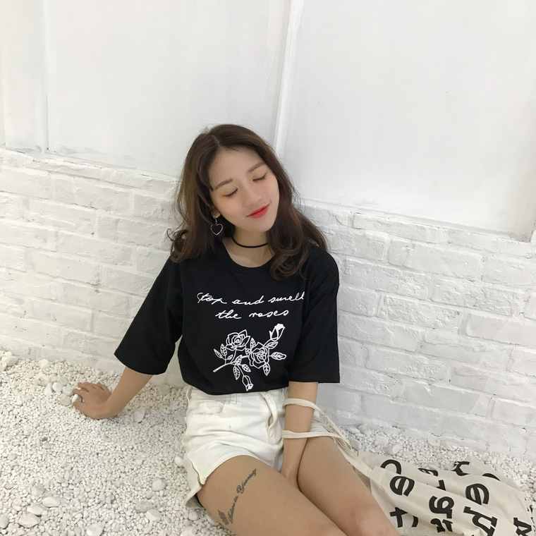 / 2017春夏新款潮流手繪風玫瑰印花套頭T恤寬松短袖休閑純色女Tee
