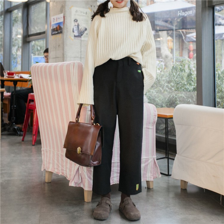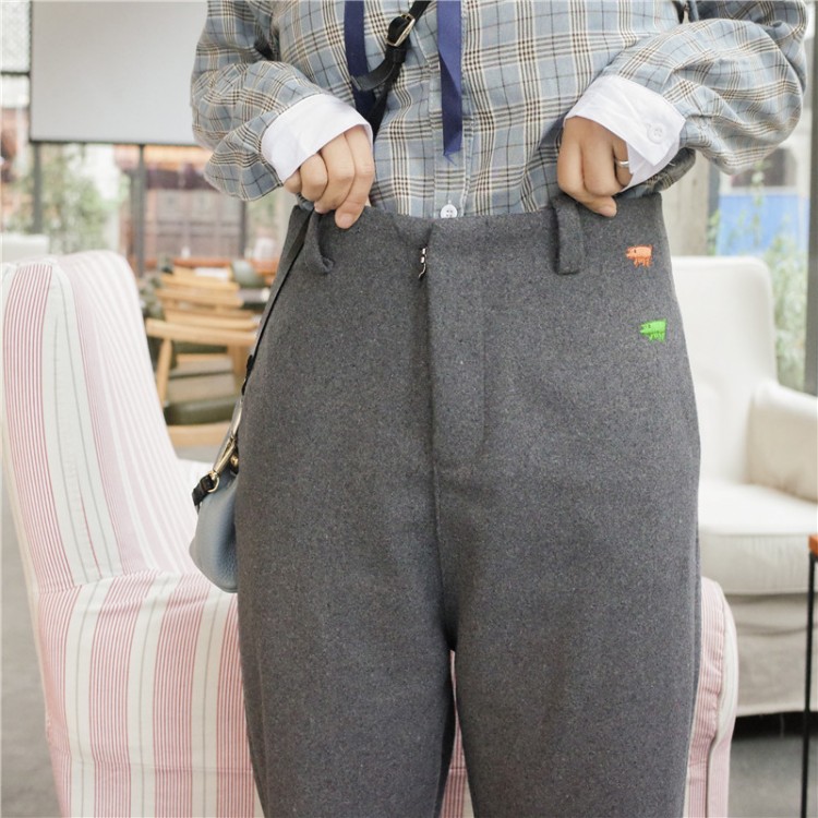 冬款韓國百搭甜美刺繡加厚毛呢西裝九分褲高腰顯瘦休閑褲女