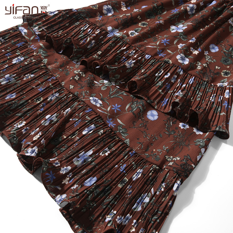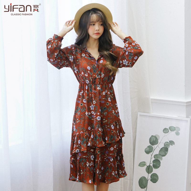 / 春夏雪紡波浪拼接長款連衣裙女裝碎花寬松長袖打底沙灘裙