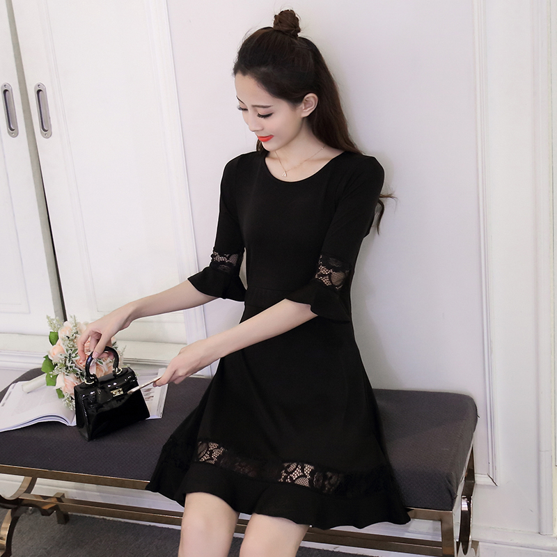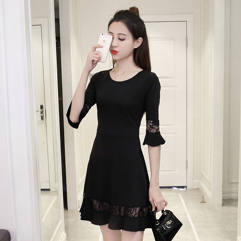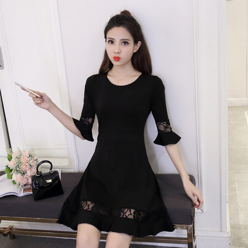 / 新款女裝韓版蕾絲拼接喇叭袖打底裙修身顯瘦七分袖連衣裙春秋