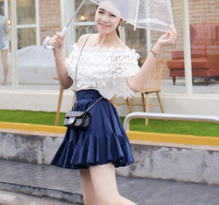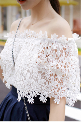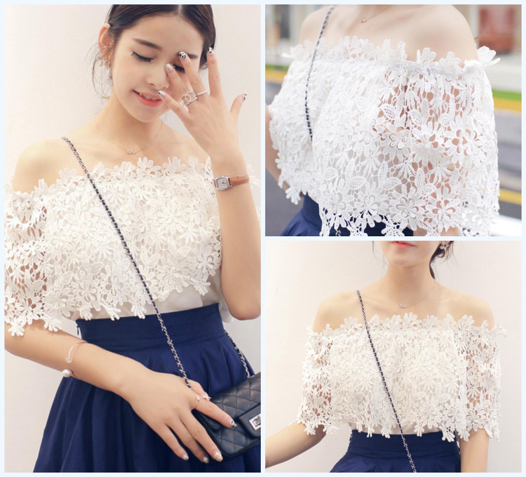 / 雪紡衫女夏裝韓版甜美鏤空一字領短袖上衣性感露肩蕾絲打底衫