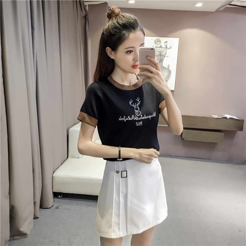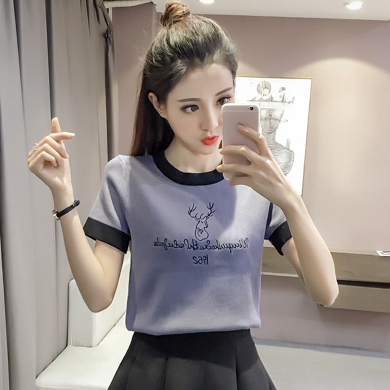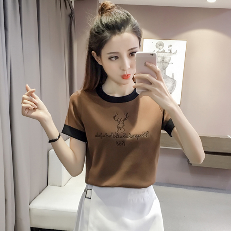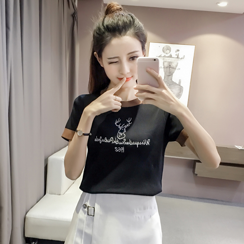 / 韓版夏裝新款小鹿繡花打底上衣修身顯瘦T恤女士短袖套頭針織小衫