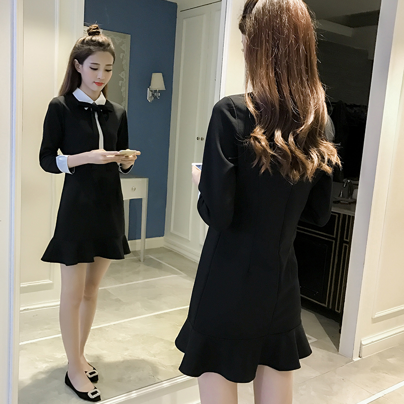 春裝新款韓版蝴蝶結娃娃領修身長袖連衣裙女秋冬荷葉邊打底裙