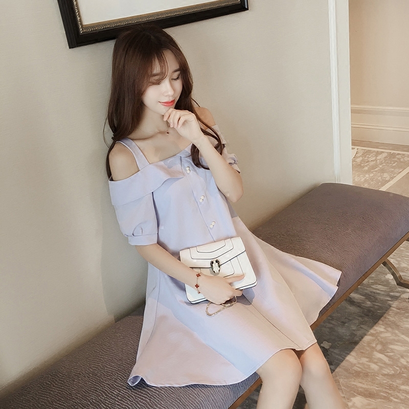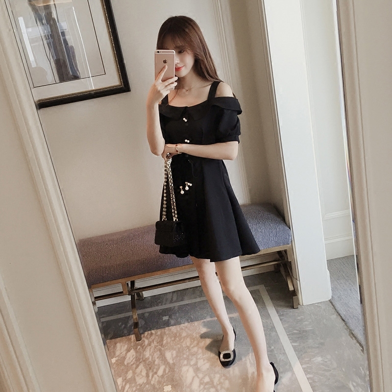 韓版女裝夏季新款大碼收腰中長裙吊帶打底裙子顯瘦露肩短袖連衣裙