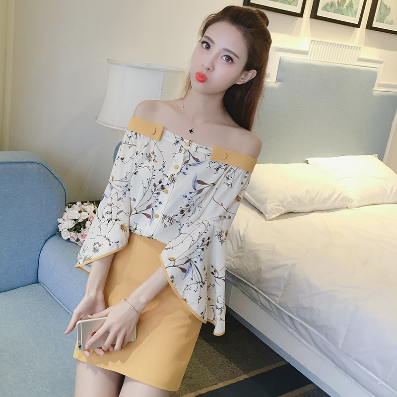 夏季韓版名媛氣質一字肩吊帶雪紡上衣兩件套女休閑半身短裙套裝潮