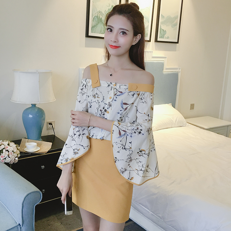 / 夏季韓版名媛氣質一字肩吊帶雪紡上衣兩件套女休閑半身短裙套裝潮