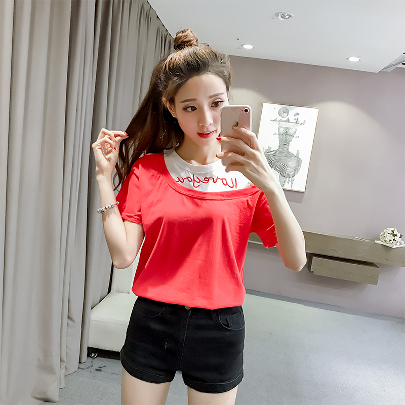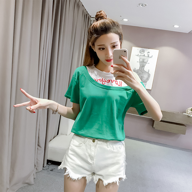 / 夏裝新款韓范字母刺繡露肩假兩件短袖T恤寬松中袖上衣學生打底衫
