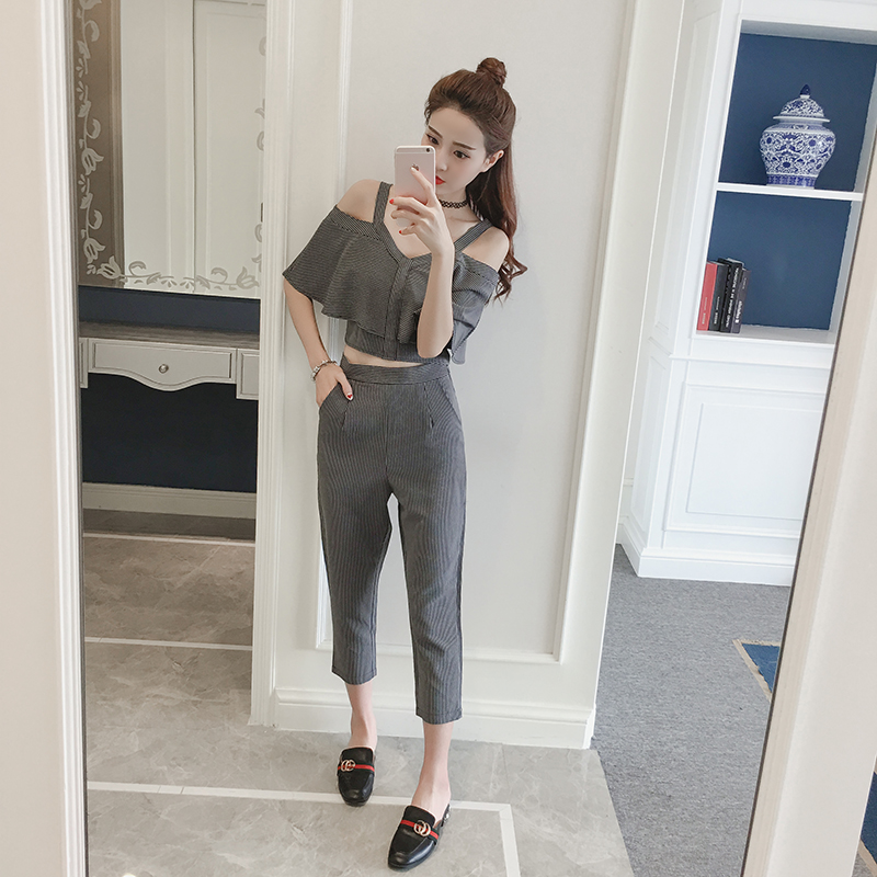 / 夏季新款女裝名媛氣質吊帶一字肩上衣兩件套女休閑七分褲條紋套裝