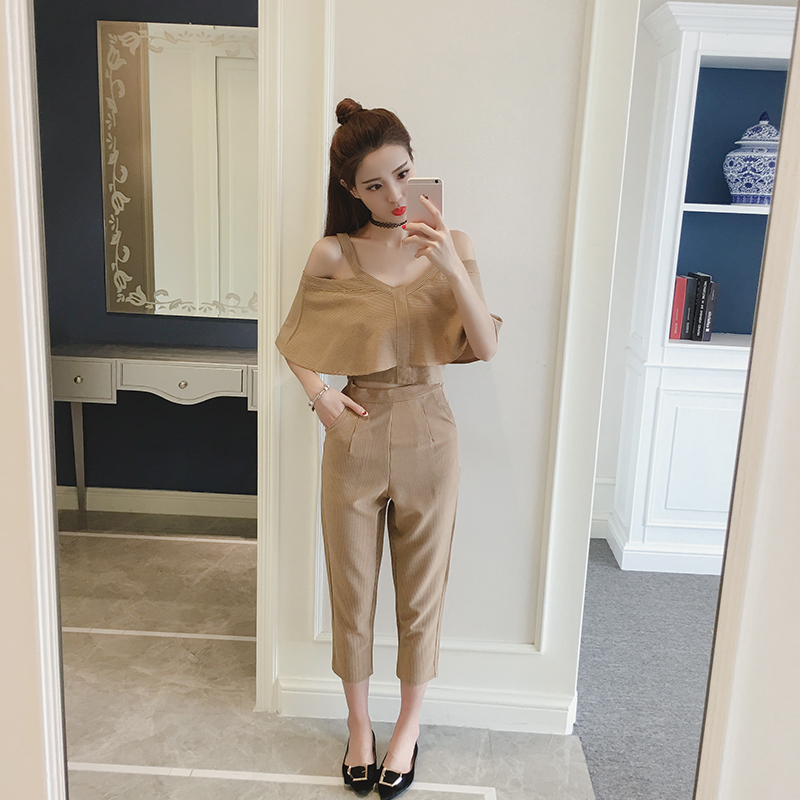 夏季新款女裝名媛氣質吊帶一字肩上衣兩件套女休閑七分褲條紋套裝