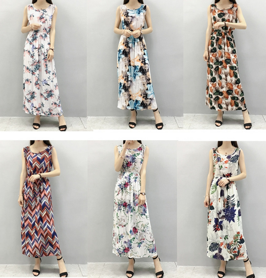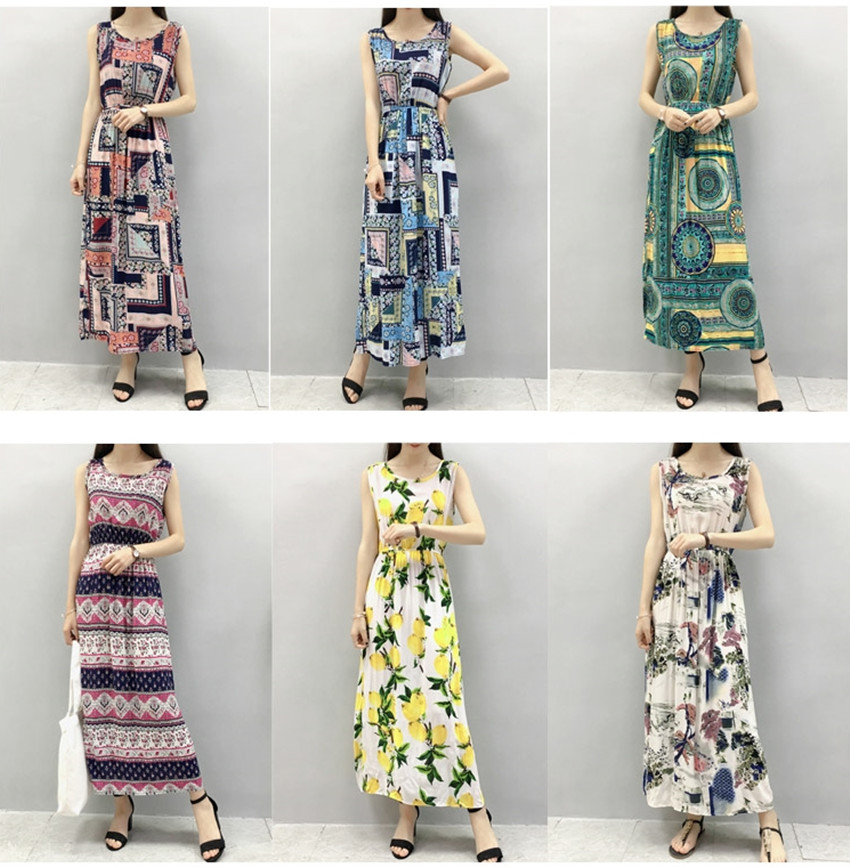 / 波西米亞綿綢連衣裙長款女棉綢夏季碎花無袖渡假沙灘人造棉長裙