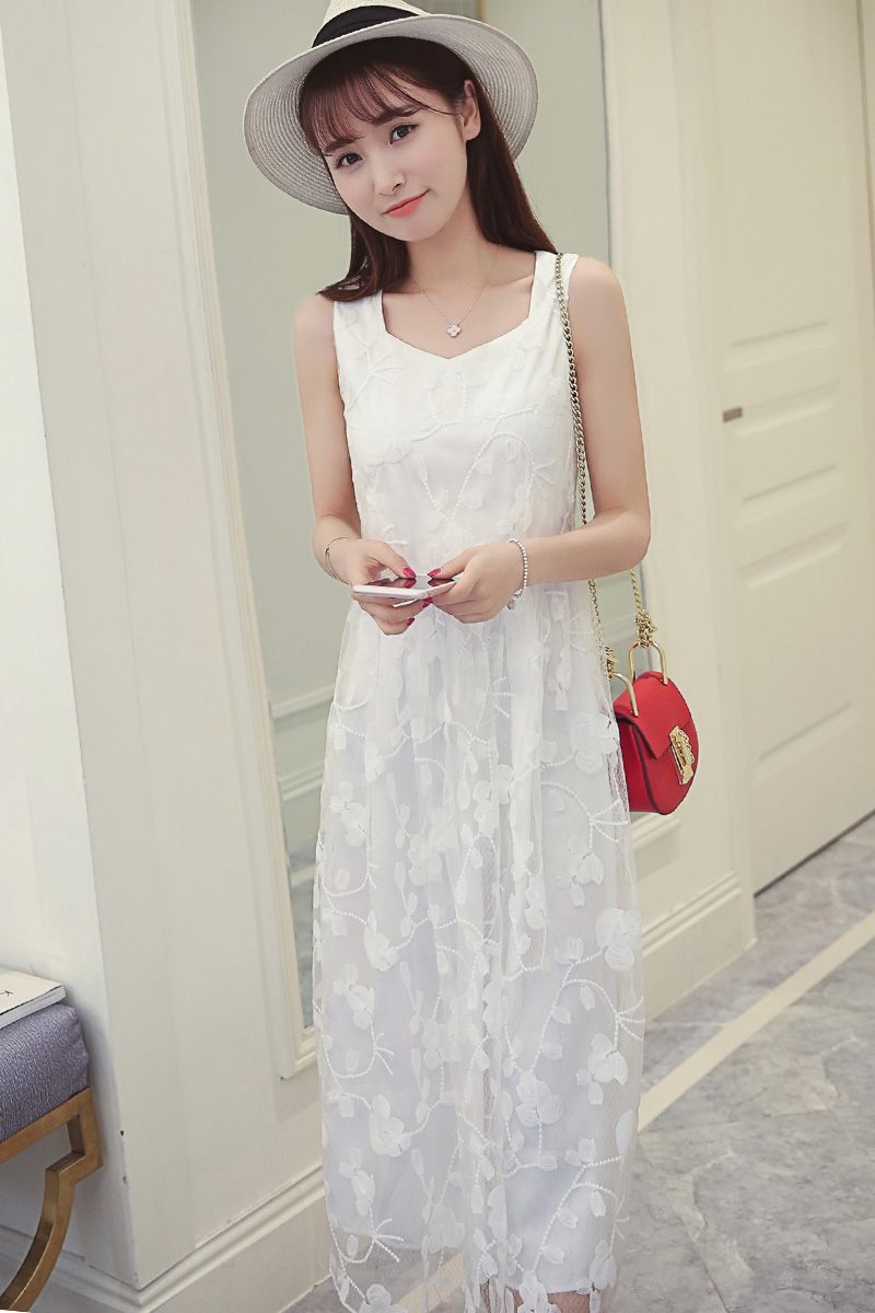 / 韓版女裝夏季新款雪紡無袖背心長裙大碼打底裙修身顯瘦蕾絲連衣裙