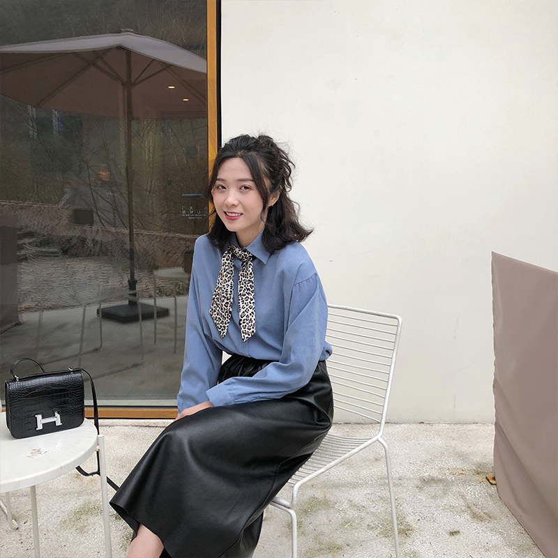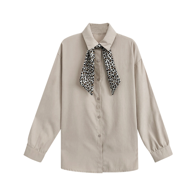 A7seven豹紋領帶襯衫女2019春裝新款時尚長袖白色韓版寬松襯衣潮