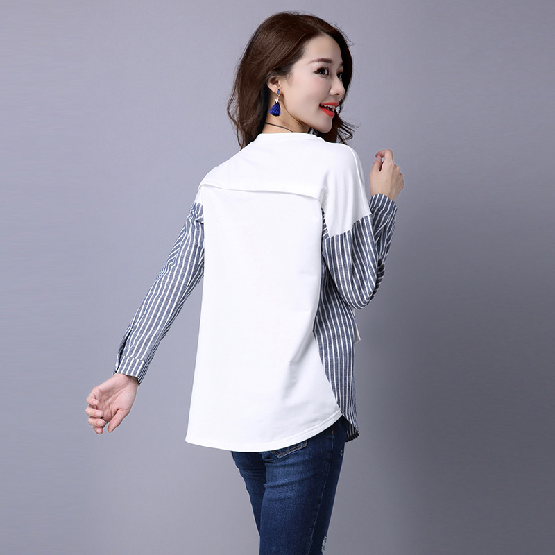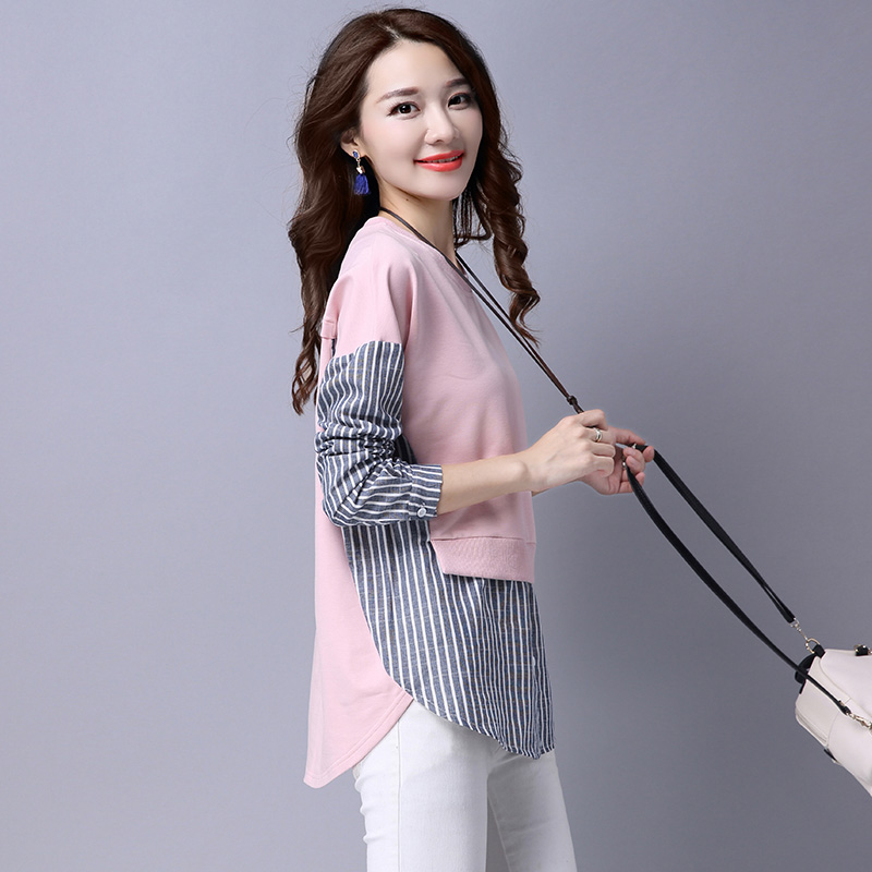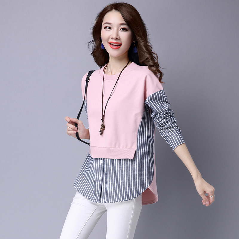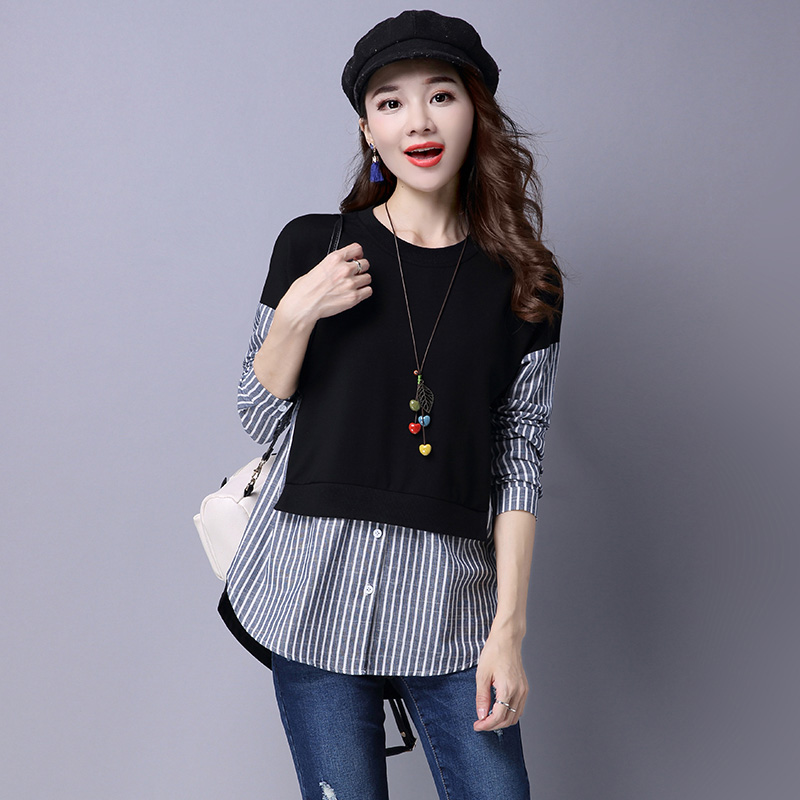 / 秋裝新款韓版衛衣拼接套頭條紋襯衫假兩件寬松顯瘦打底上衣女