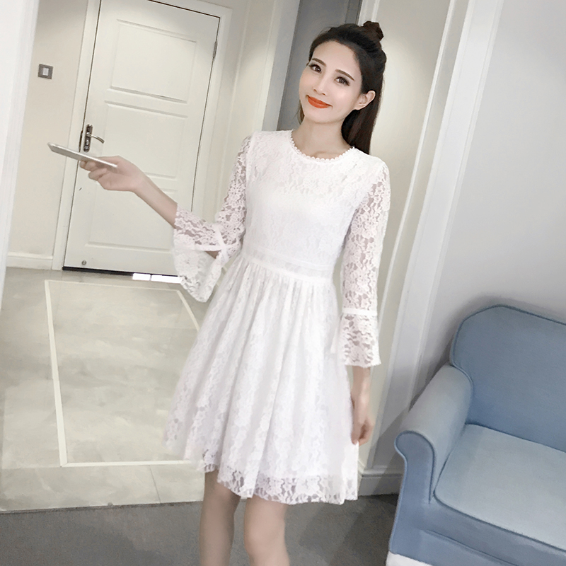 / 春裝新款女裝韓版喇叭袖打底裙女修身高腰長袖蕾絲連衣裙秋冬