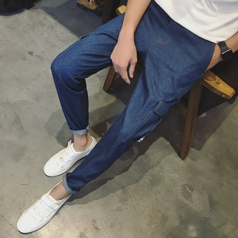 秋季新品韓版側邊口袋錐形小腳牛仔褲男士哈倫褲潮