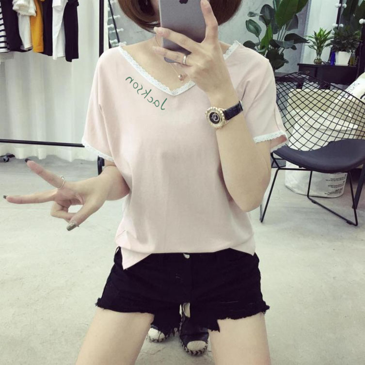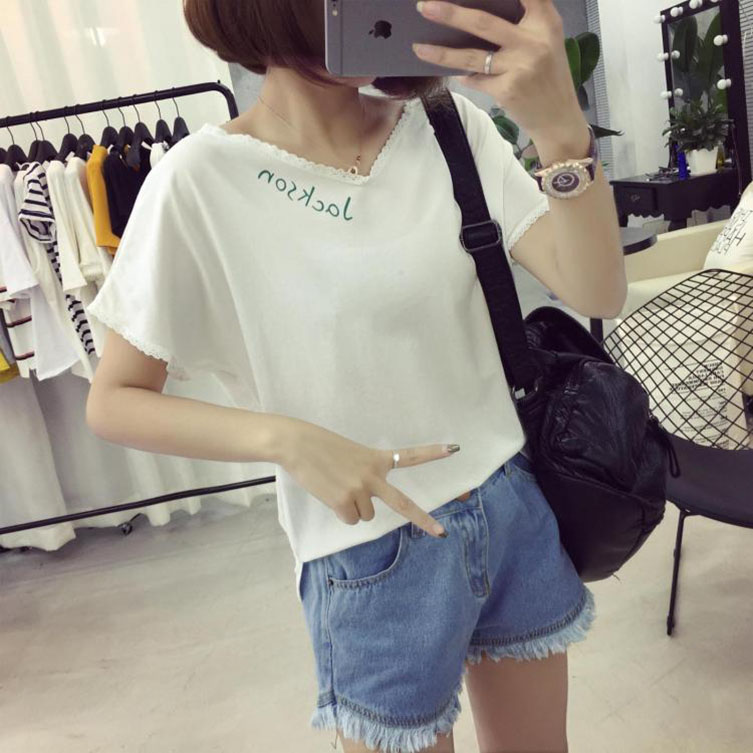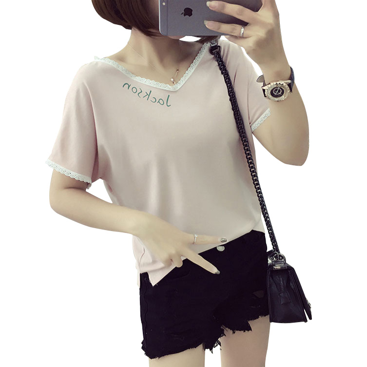 夏季韓版V領花邊拼接T恤女學生短袖上衣字母打底衫潮半袖修身小衫