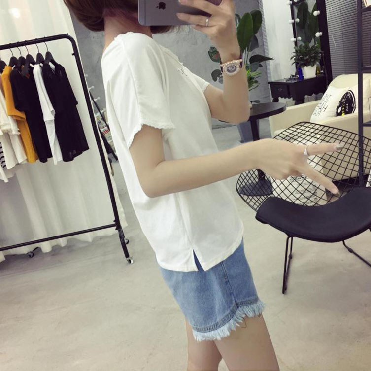 / 夏季韓版V領花邊拼接T恤女學生短袖上衣字母打底衫潮半袖修身小衫