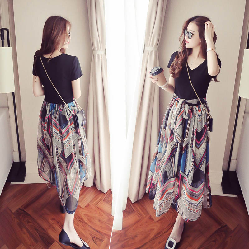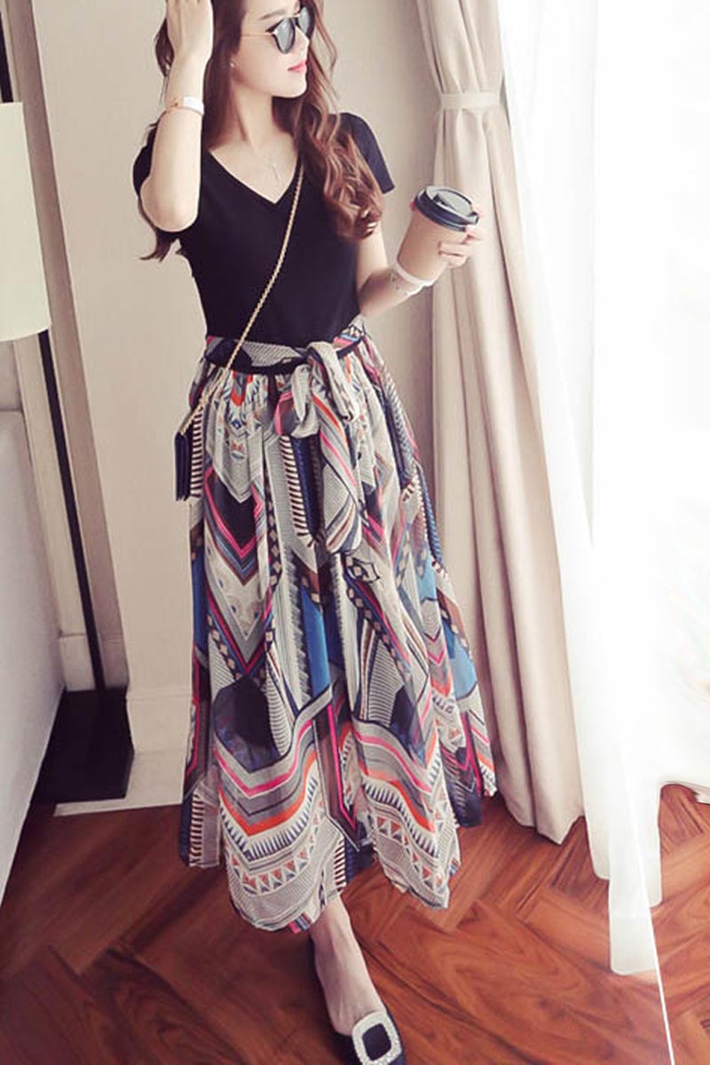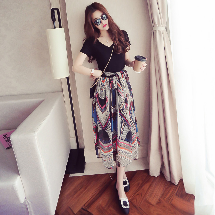 / 夏季女裝新款海邊沙灘中長裙子修身短袖公主裙印花波西米亞連衣裙