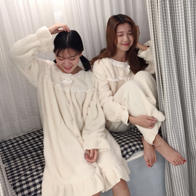 秋冬甜美荷葉邊長袖珊瑚絨保暖睡衣家居服套裝睡裙閨蜜款女士
