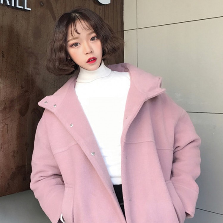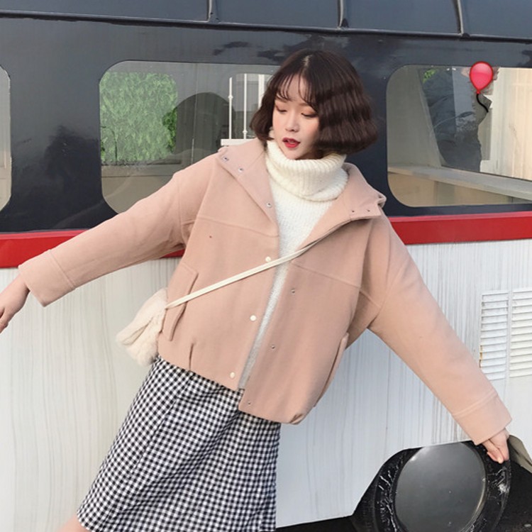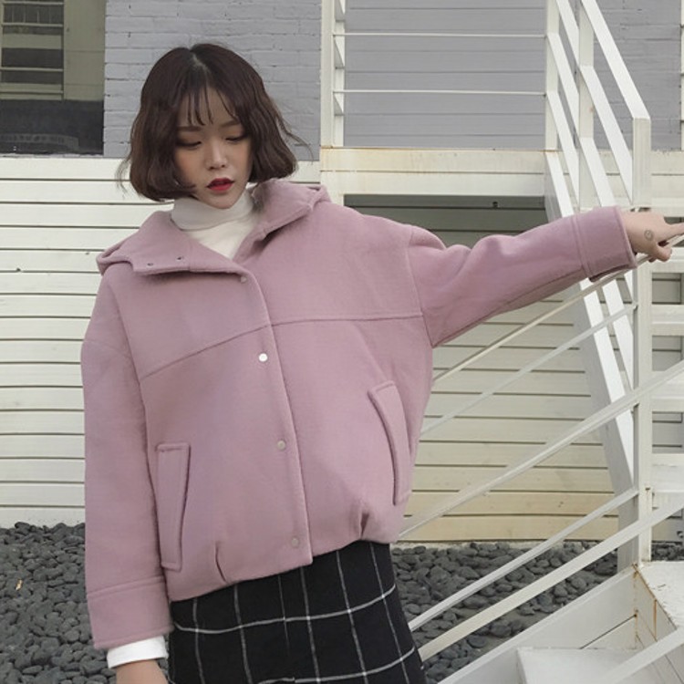 冬款韓國學院風簡約連帽拼接純色休閑百搭加厚短款毛呢外套女