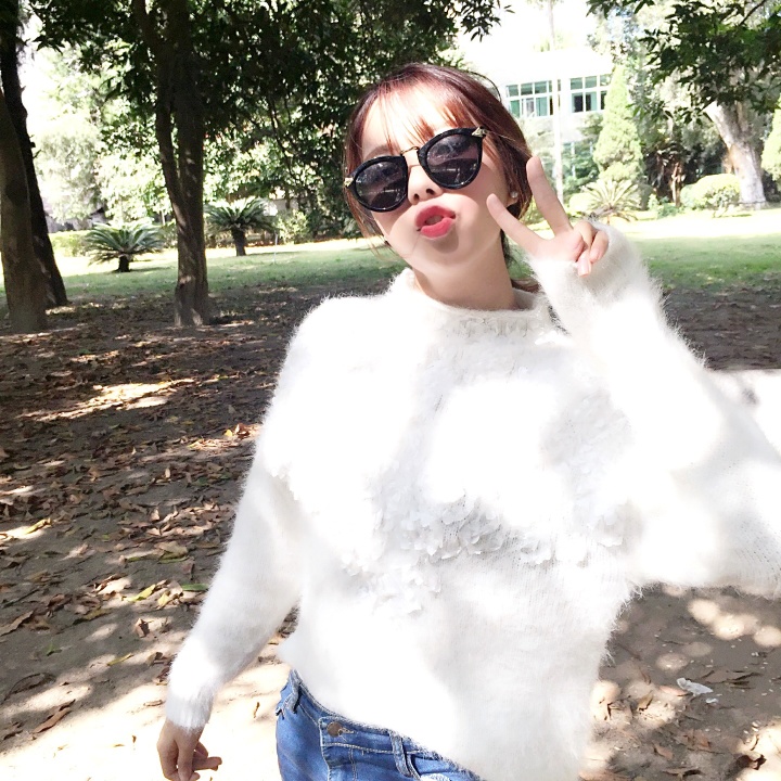 / 韓國秋冬款百搭時尚立體盤花圓領套頭白色保暖打底針織毛衣女