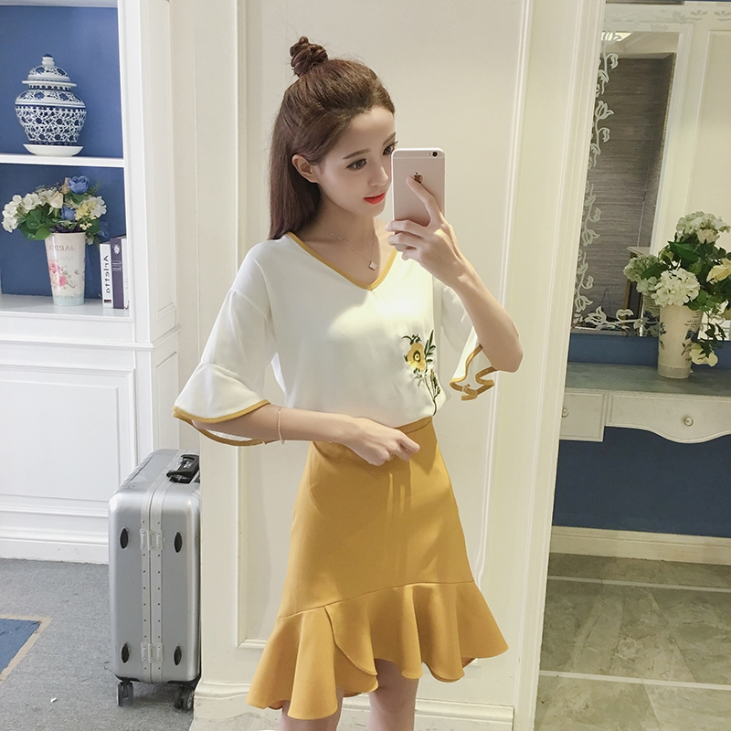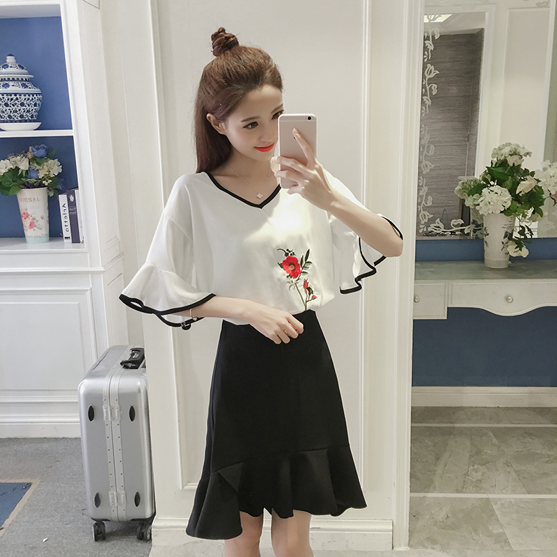 夏季新款女裝韓版喇叭袖刺繡上衣休閑半身魚尾裙雪紡兩件套裝