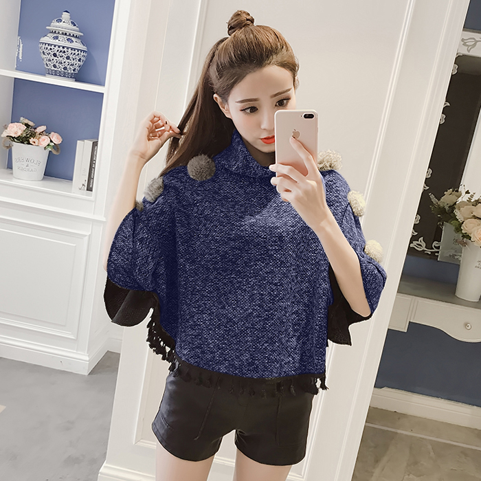 秋裝新款女韓版時尚毛球斗篷上衣百搭寬松蝙蝠袖短款流蘇外套女裝