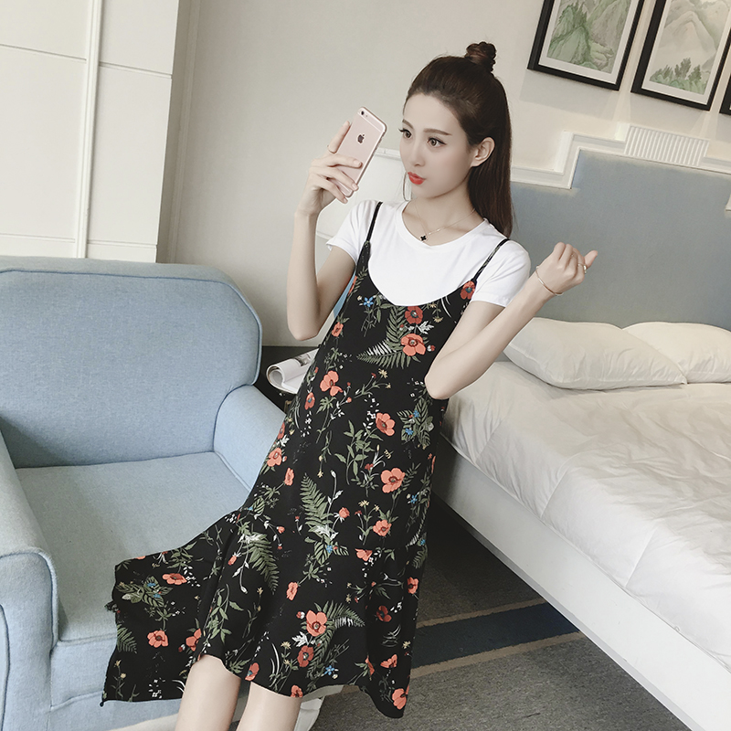 新款女裝復古中長款不規則下擺寬松顯瘦碎花雪紡吊帶連衣裙夏
