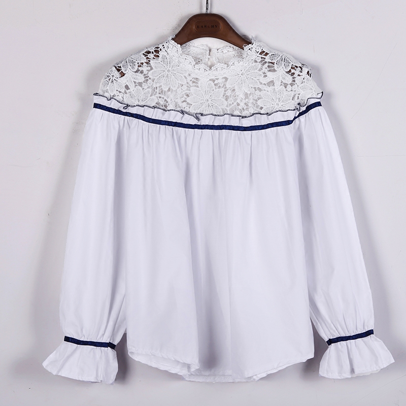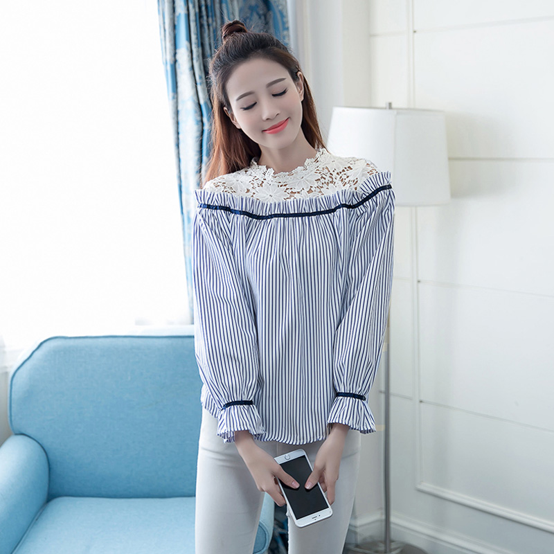 / 春季新款韓版甜美長袖條紋襯衫女寬松上衣蕾絲拼接鏤空娃娃衫