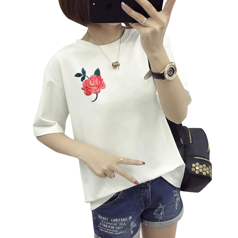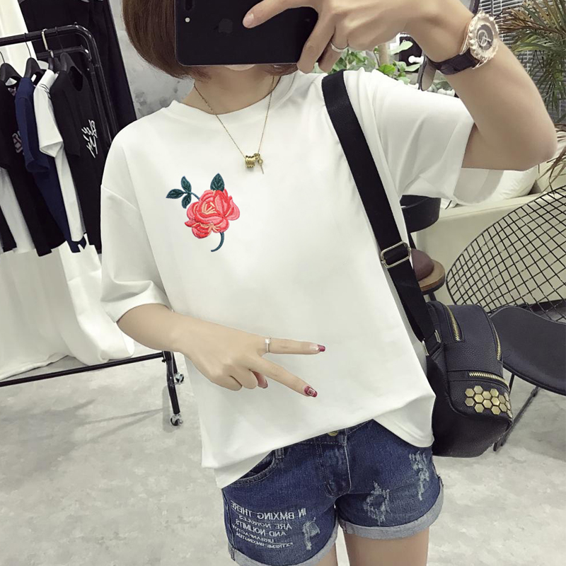 / 夏裝女裝短袖t恤女學生刺繡玫瑰花套頭小衫顯瘦大碼體恤韓版上衣