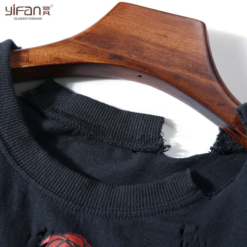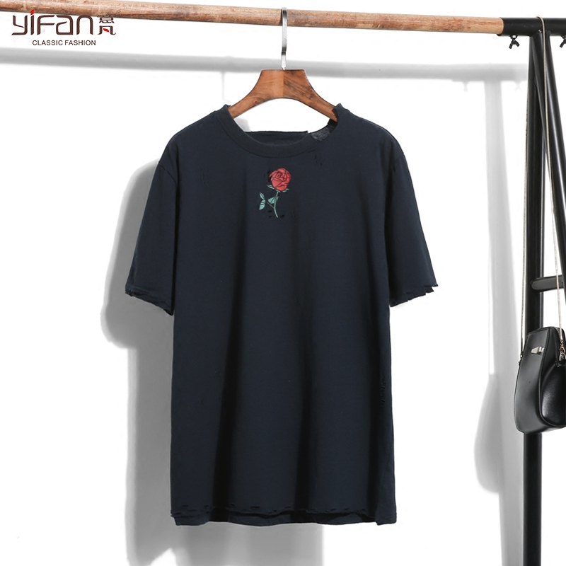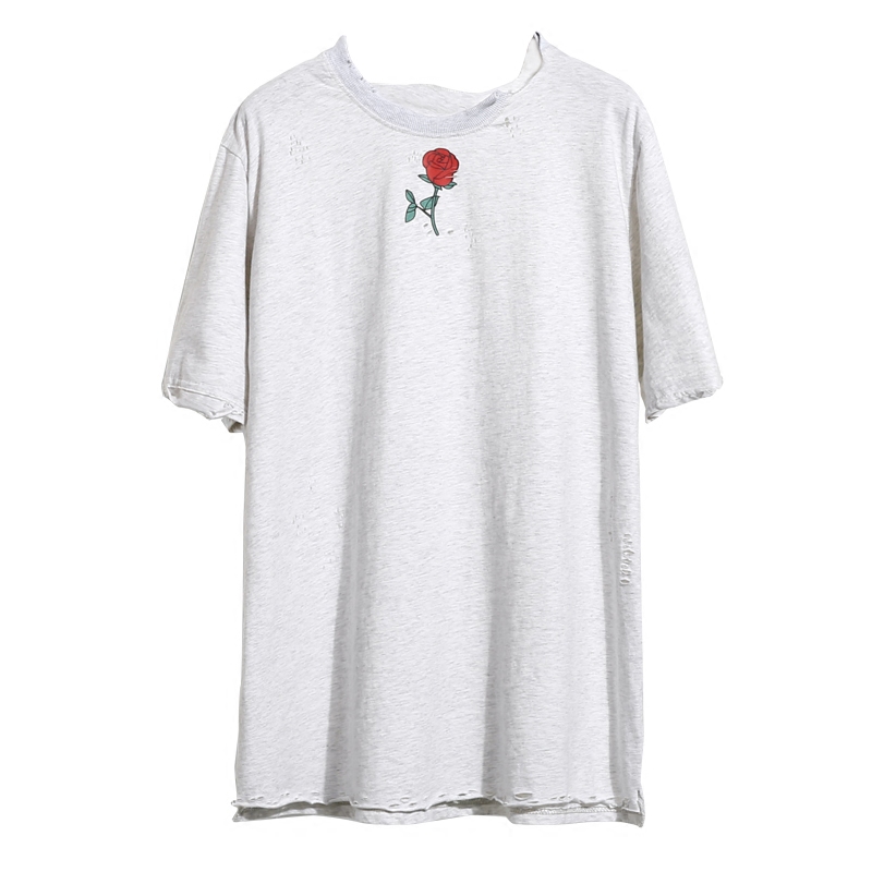 / 夏季寬松上衣韓國休閑破洞圓領短袖T恤女套頭玫瑰印花做舊