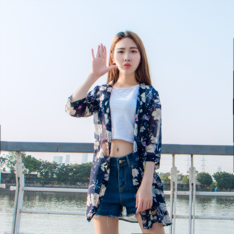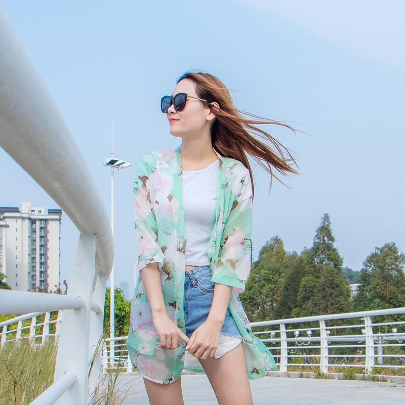 / 防曬衣服女夏季2017中長款薄外套百搭印花寬松大碼顯瘦雪紡衫開衫