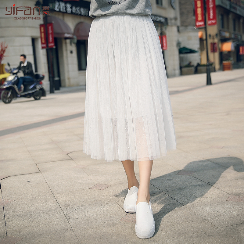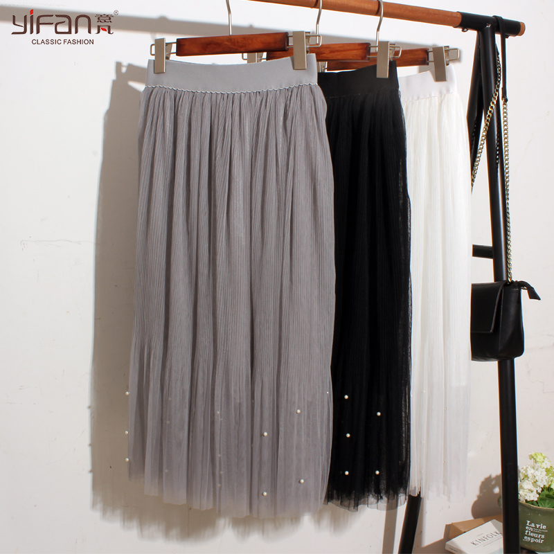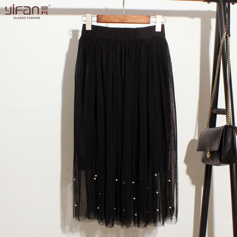 / 春夏女裝清新松緊腰寬松釘珠紗網中裙純色大裙擺半身裙