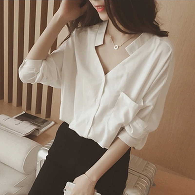 2017春裝新款韓范學院風白色襯衫修身顯瘦蝙蝠袖V領女雪紡衫襯衣