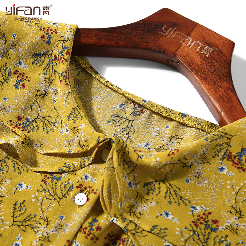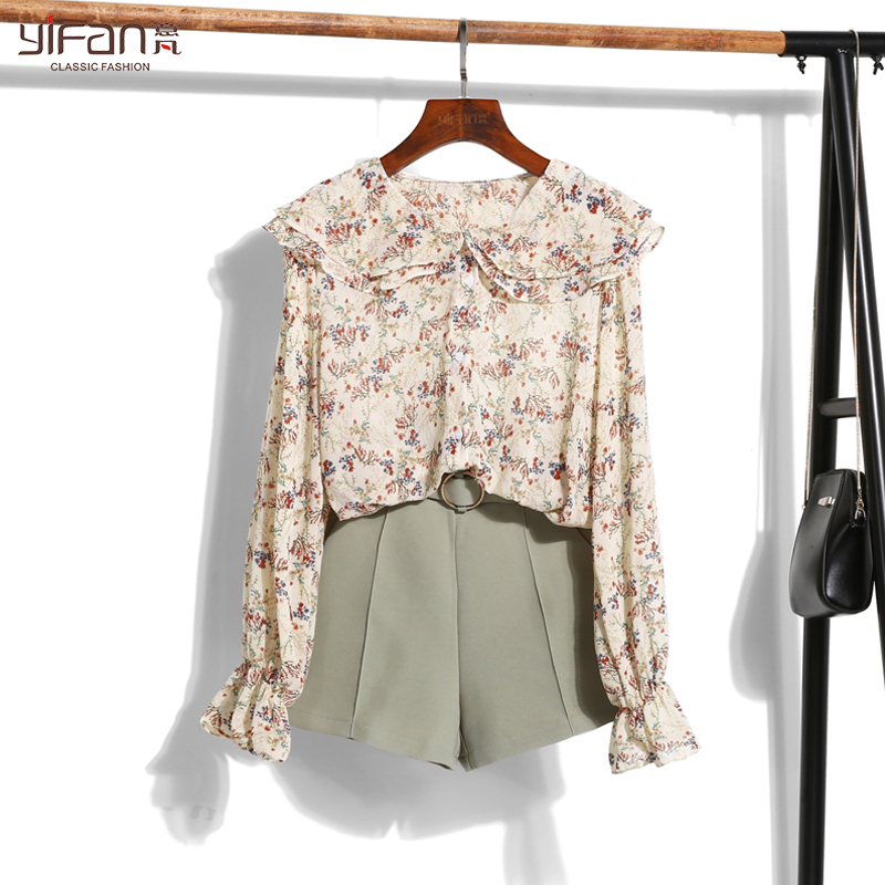 / 春夏新款韓版喇叭袖荷葉邊印花上衣女娃娃領襯衫碎花雪紡衫女長袖