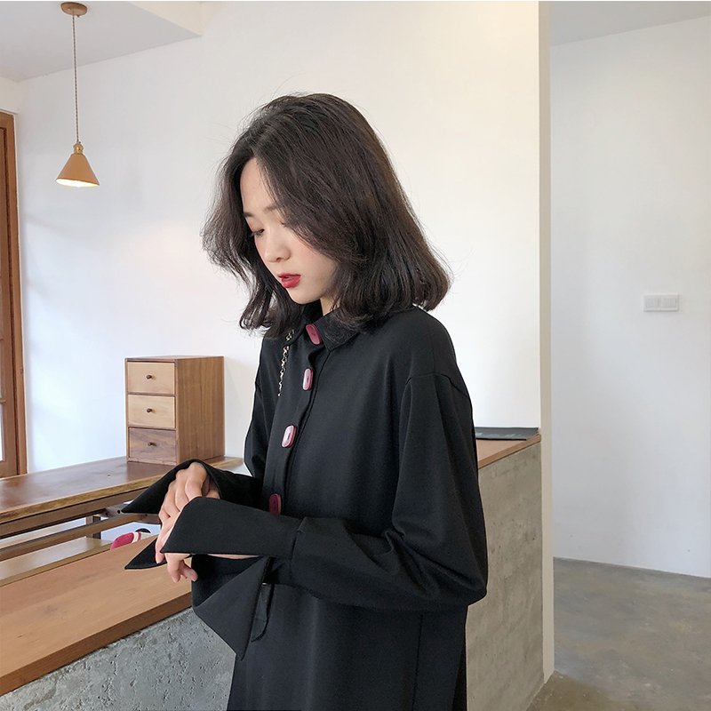 A7seven 黑色連衣裙女中長款2019春新款韓版寬松荷葉邊過膝魚尾裙