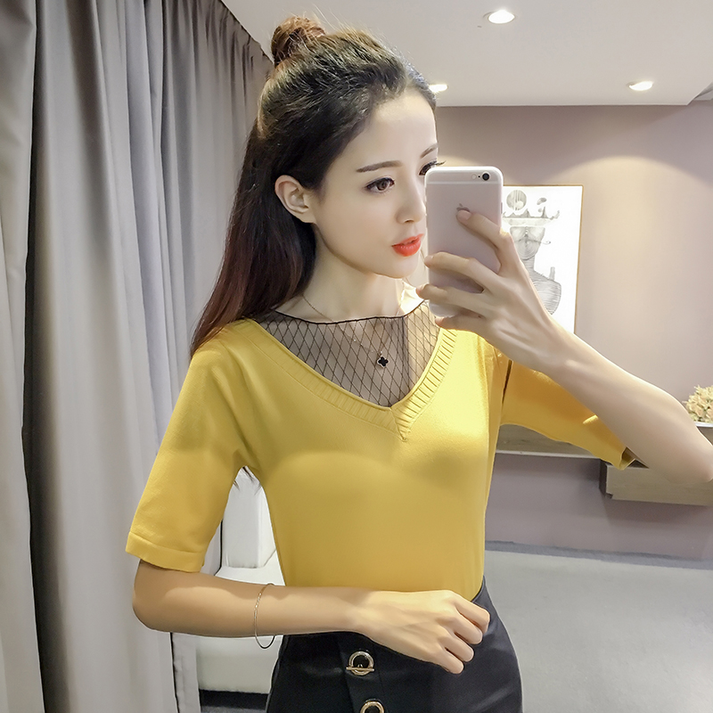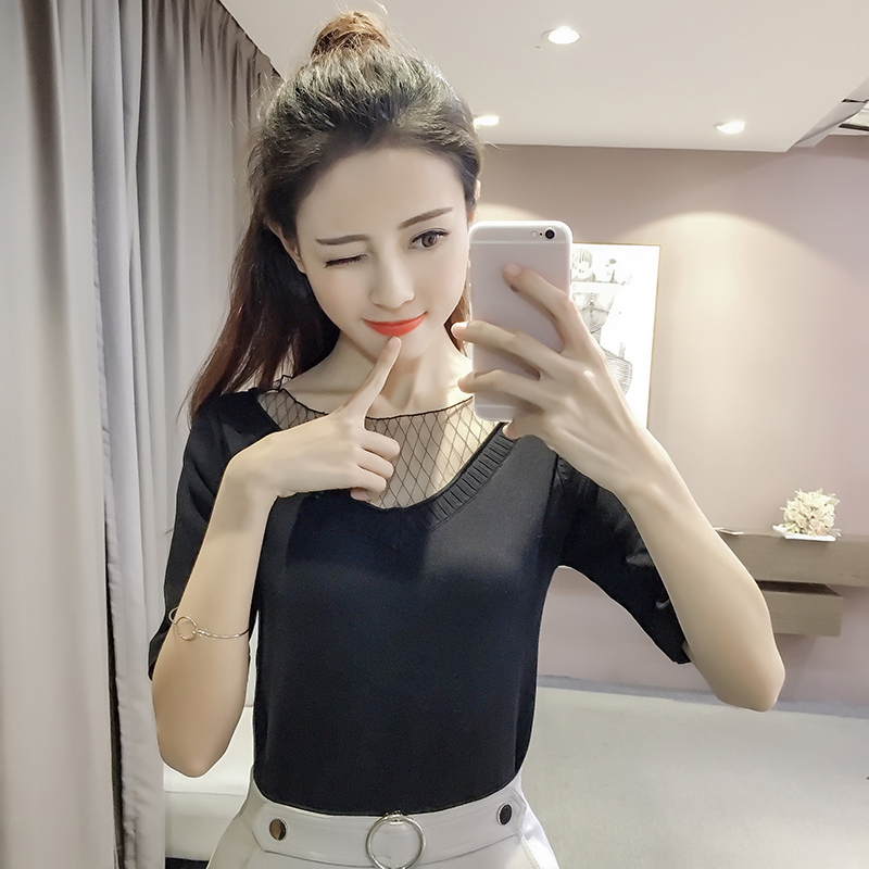 夏季新款韓版網紗拼接V領條紋上衣修身顯瘦T恤女短袖打底針織小衫