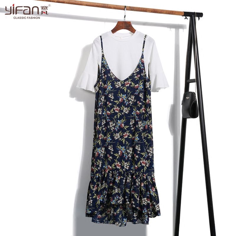 韓版夏季連衣裙女v領時尚寬松顯瘦中長款荷葉邊雪紡吊帶長裙