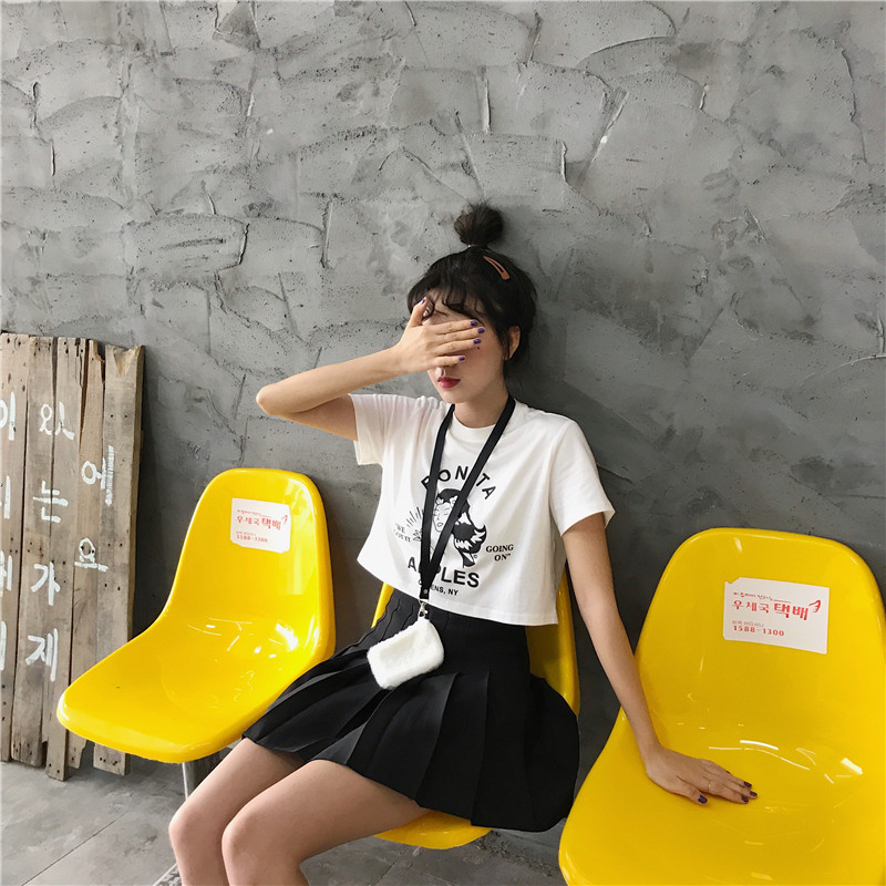 VeilOpening白色卡通印花t恤超火cec短袖女+冷淡風學生高腰百褶裙