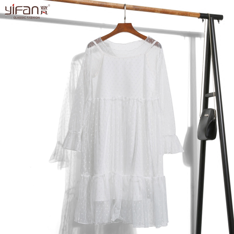/ 春夏雪紡波點鏤空中長款連衣裙修身打底吊帶背心蕾絲裙兩件套