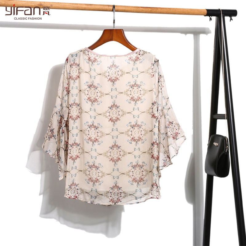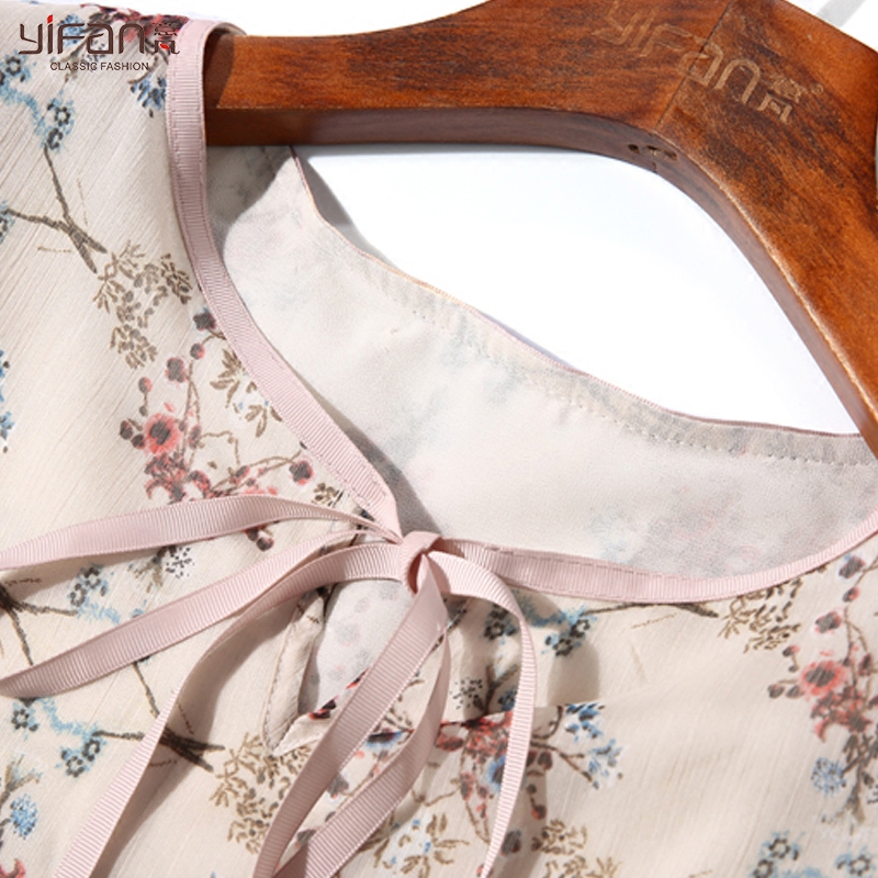 / 夏季女碎花短袖系帶雙層雪紡衫韓版寬松甜美荷葉邊七分喇叭袖上衣