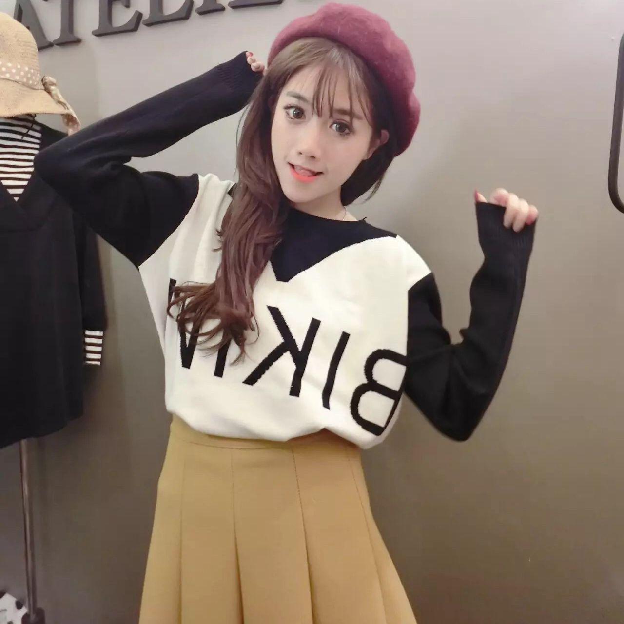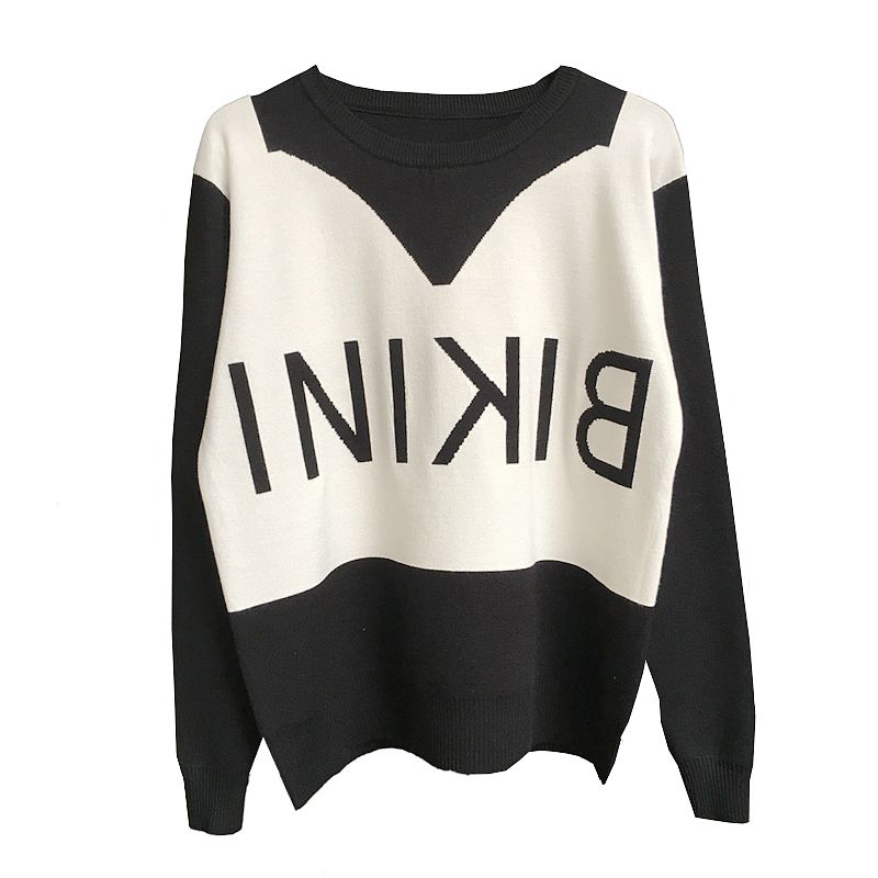 學院風圓領毛衣女秋冬撞色字母韓版百搭打底衫套頭長袖寬松針織衫