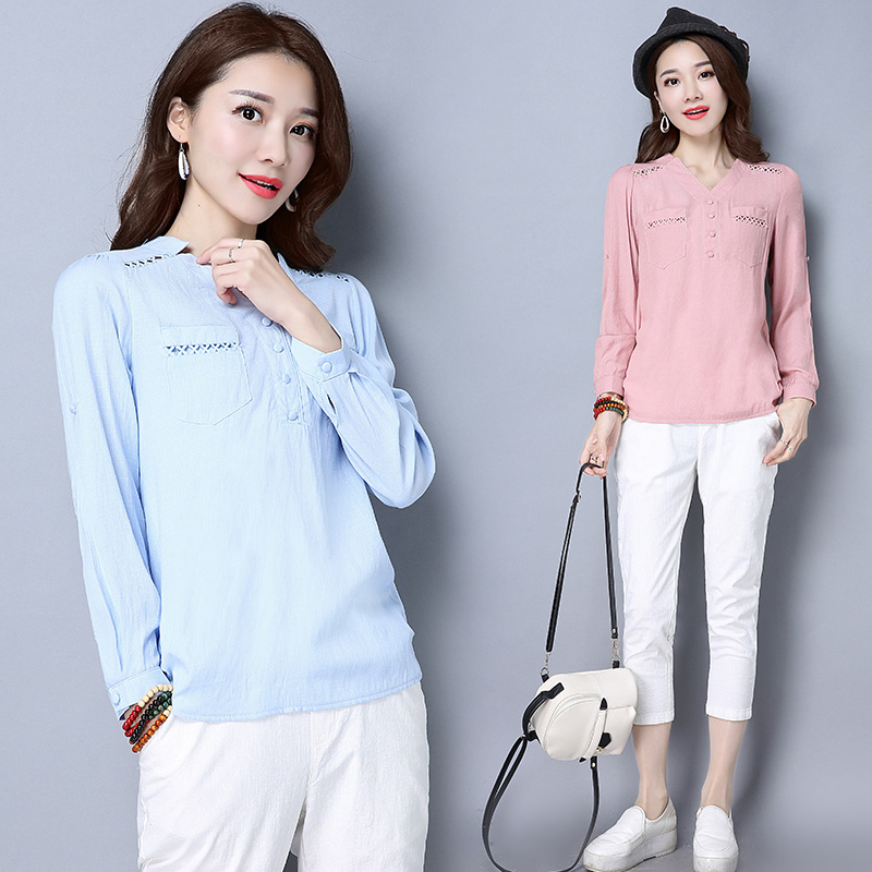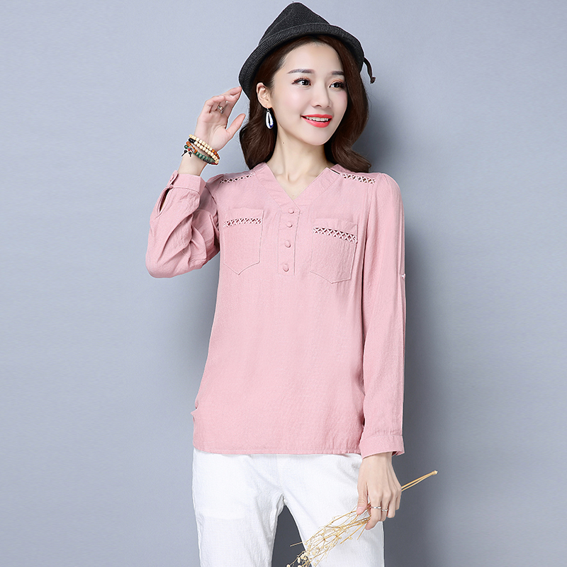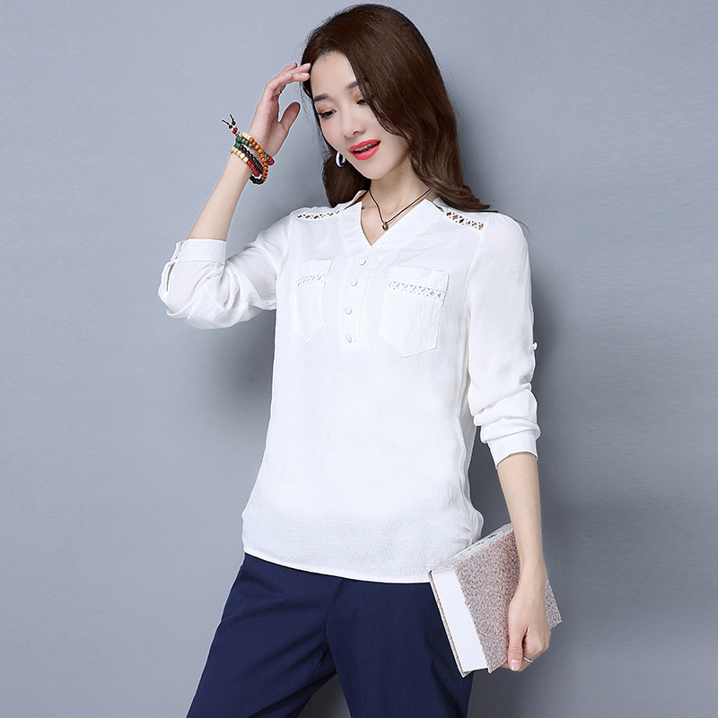 / 春季新款棉麻襯衫女長袖上衣大碼寬松簡約V領白襯衣百搭T恤潮