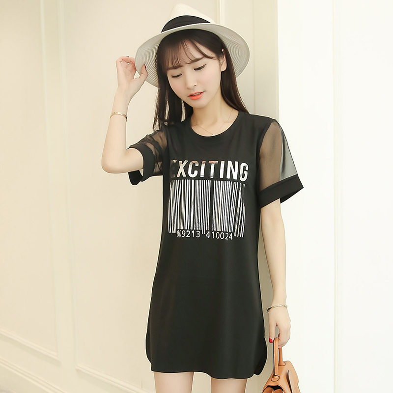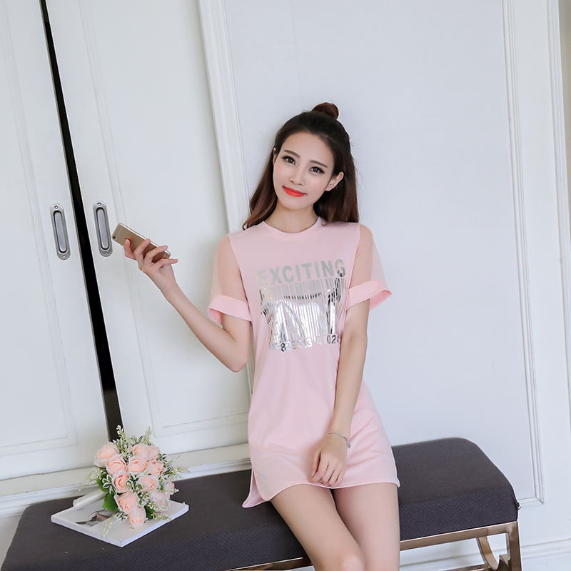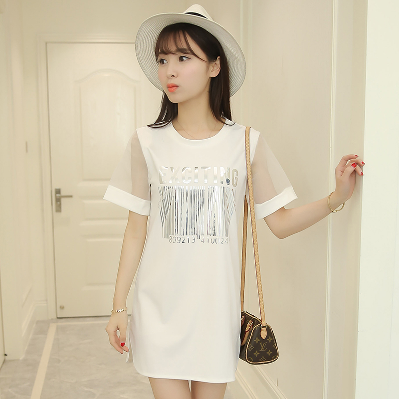 / 夏季女裝韓版新款亮片拼接上衣短袖中長款t恤裙歐根紗大碼連衣裙